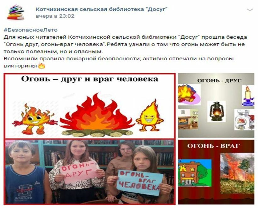 В Котчихинской сельской библиотеке «Досуг» с детьми состоялся актуальный диалог на тему «Огонь друг, огонь враг». В ходе встречи были рассмотрены полезные и опасные свойства этого необходимого средства человеческого бытия, была представлена страшная статистика пожаров, бушующих на территории России этим летом, случившихся в ряде случаев по вине человека. В заключение участники вспомнили правила пожарной безопасности, ответили на вопросы викторины.