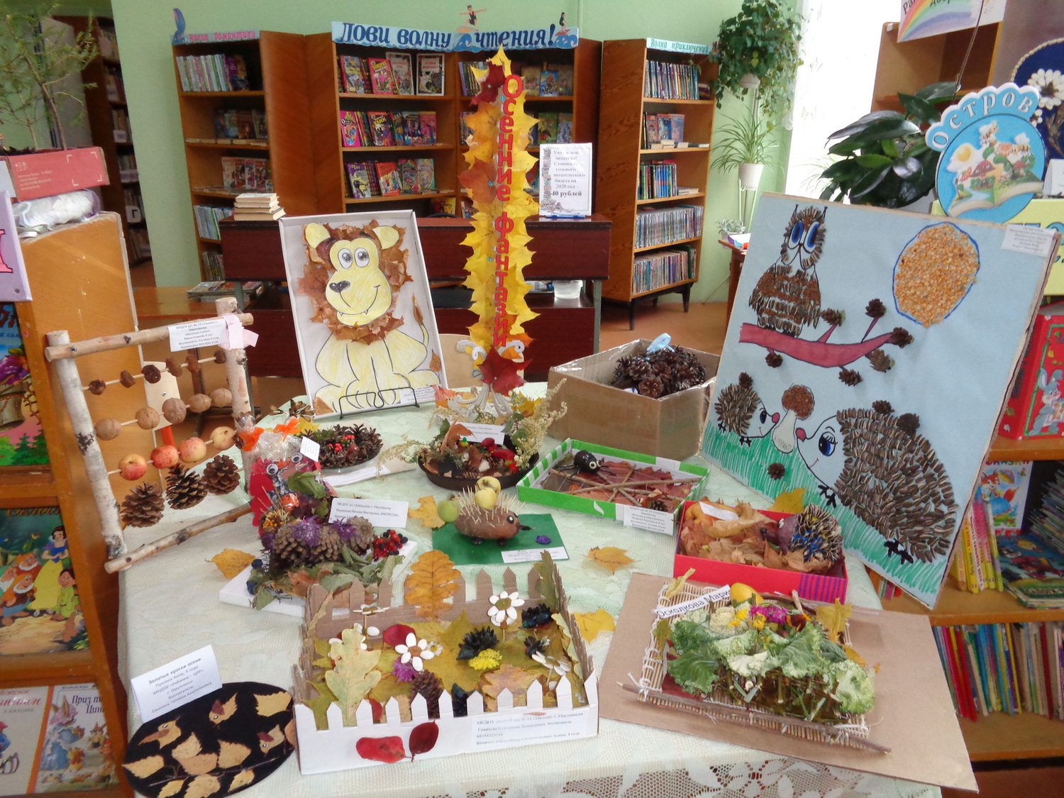 В Детской библиотеке «Маяк» прошел конкурс поделок из природного материала «Осенние фантазии», организованный среди воспитанников детских садов города. Дети совместно с родителями создали прекрасные осенние композиции, так в библиотеке поселилось семейство сов, не менее десяти ежей, зацвела лесная полянка, корзинки с дарами осени, сказочные домики с фантастическими жильцами и тд. Презентация творческих работ состоялась во дворе библиотеки, участниками которой стали воспитанники из ближайших дошкольных учреждений. Детям представилась возможность найти свои поделки, внимательно рассмотреть работы других участников, после чего они с удовольствием знакомились с книгами про осень, отвечали на вопросы викторины. В этот день победителям конкурса были вручены дипломы и памятные подарки, всем участникам – сертификаты. В заключение герои экспозиции переселились в библиотеке.
