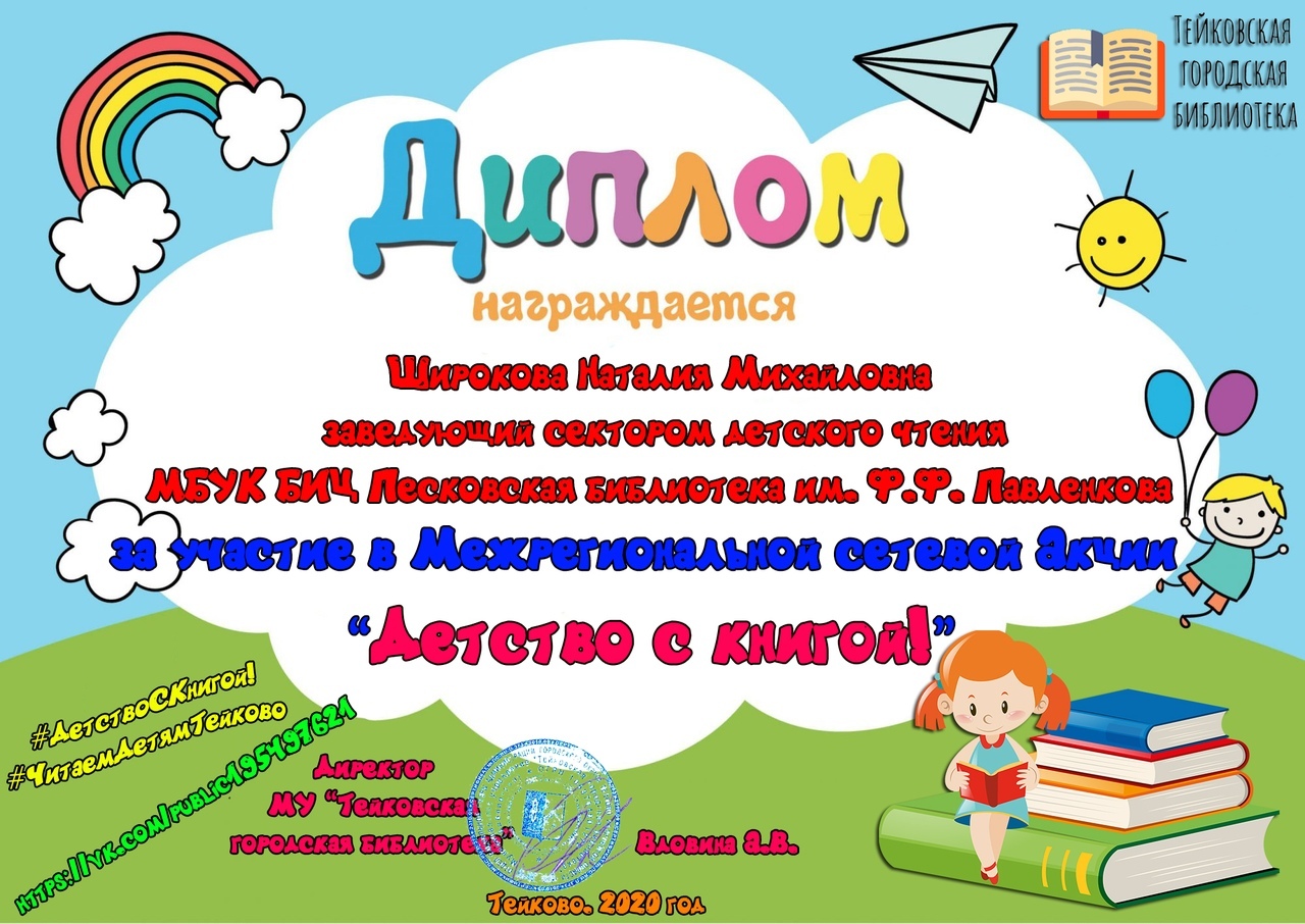 Детство – это самая беззаботная и счастливая пора в жизни. Нам взрослым, очень важно прикладывать максимум усилий для того, чтобы наше подрастающее поколение в будущем имело только теплые воспоминания о своих детских годах.Сотрудники Песковской библиотеки им. Ф.Ф. Павленкова присоединились к межрегиональной сетевой Акции «Детство с книгой!», организованной Тейковской городской библиотекой и приуроченной к Международному дню защиты детей.
