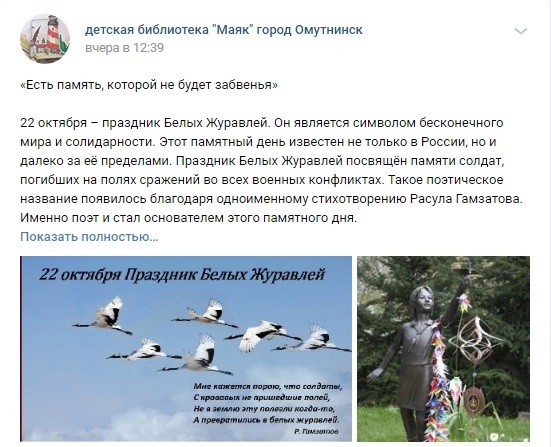 Детская библиотека «Маяк» на страницах библиотеки социальных сетях «ВКонтакте» и «Одноклассники» пригласила подписчиков и гостей присоединиться к патриотической акции «День белых журавлей», поэтическое название и памятная дата появились благодаря поэту Расулу Гамзатову – автору стихотворения «Журавли», поражённому историей японской девочки Сасаки Садако, верившей, что тысяча журавликов, сделанных из бумаги спасут ей жизнь. Вскоре к стихам была написана музыка и песня впервые прозвучала в исполнении М.Бернеса, а День белых журавлей стал символом мира и солидарности.