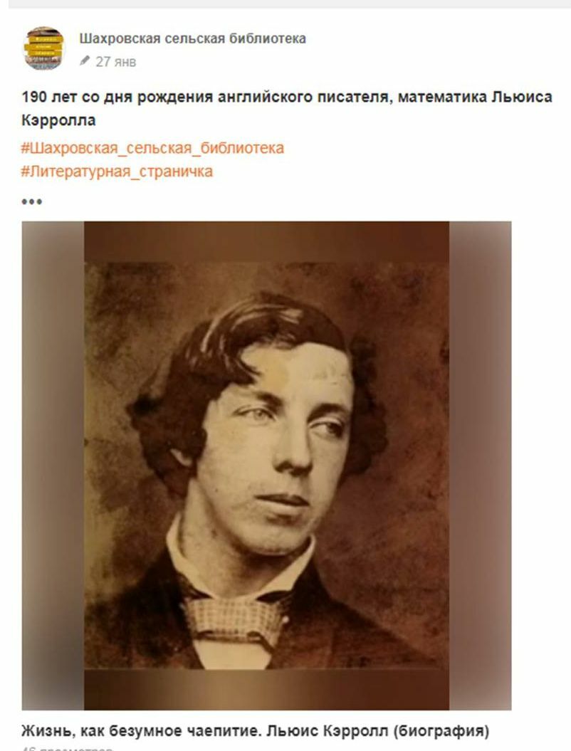 Шахровская сельская библиотека познакомила пользователей с жизнью и творчеством Льюиса Кэрролла, английского писателя, математика, философа, автора книги «Алиса в стране чудес». Знакомство с творчеством автора началось с видео-публикации «Жизнь, как безумное чаепитие», более подробно представившая книги «Алиса в Стране Чудес» и «Алиса в Зазеркалье». Неповторимое своеобразие кэрролловского стиля, необычные ситуации, в которые попадает главная героиня, удивительные превращения, происходящие с ней, забавные герои, с которыми Алиса встречается во время своих путешествий – все это и есть Страна Чудес, край удивительных вопросов и еще более удивительных ответов, познакомиться и прочитать о которых интересно в любом возрасте.