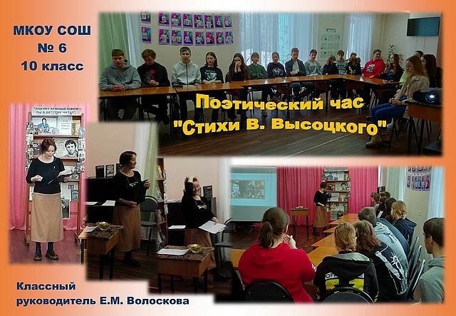 № 6, прошел поэтический час «Стихи Владимира Высоцкого», посвященный юбилейной дате выдающегося артиста, поэта и музыканта. Выбор темы очередной встречи был сделан не случайно. Есть люди, которые метеоритом врываются в жизнь, оставляя после себя неизгладимый след. Они при жизни еще становятся легендой, одно упоминание их имени согревает душу, делает добрей и чище, таким метеоритом является творчество Владимира Семеновича Высоцкого для многих миллионов россиян разных поколений. В рамках мероприятия была оформлена книжная выставка «Значит, нужные книги ты в жизни читал». Немногие из старшеклассников решились принять участие в импровизированном «Открытом микрофоне», прочесть стихи или тексты песен Владимира Высоцкого. Но те, кто решились – сделали серьезный выбор из репертуара автора. В ходе встречи эмоционально и ярко звучали его произведения, интервью с Высоцким, фрагменты театральных постановок, кадры из многочисленных фильмов. Знакомство нового молодого поколения с творчеством Владимира Семеновича состоялось, об этом говорят отзывы ребят «Очень интересное мероприятие. Нам дали возможность самим прочитать стихи такого великого человека, что очень понравилось…». Необходимо отметить, что такого рода встречи расширяют кругозор молодых людей, способствуют развитию познавательной деятельности, творческих способностей, выразительному чтению, сценическому мастерству, воспитанию патриотических чувств.