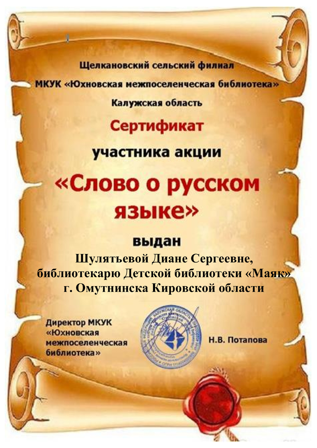 Библиотекари Детской библиотеки «Маяк» присоединились к сетевой акции «Слово о русском языке», организатором которой стал Щелкановский сельский филиал МКУК «Юхновская межпоселенческая библиотека» Калужской области. Для участия в акции необходимо было выбрать цитату о русском языке, алфавите или грамоте из любого художественного произведения, опубликовать свое фото вместе с книгой, из которой была взята цитата, в любой социальной сети. Библиотекарями было выбрано два произведения: А.С. Пушкина «Евгений Онегин» и И.С. Тургенева «Русский язык». Акция была приурочена к Дню славянской письменности и культуры.