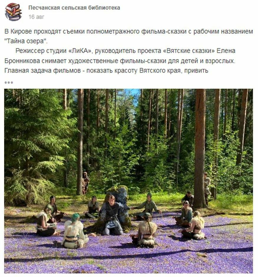 В преддверие Ночи кино Песчанская сельская библиотека знакомила пользователей с творчеством Елены Бронниковой, режиссера студии «ЛиКА», руководителя проекта «Вятские сказки», которая сейчас снимает в Кирове кино – сказку под рабочим названием «Тайна озера». Этот фильм о дружбе, преданности, взаимовыручке, отваге. Съёмки проходят в живописных местах Кировской области. Необходимо отметить, что «Вятские сказки» в стиле фэнтези известны киноманам всей страны.