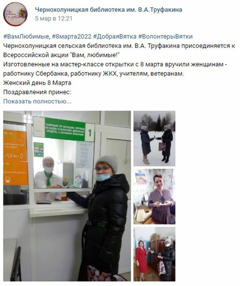 Чернохолуницкая сельская библиотека им. В.А. Труфакина присоединилась к Всероссийской акции «Вам, любимые!». Изготовленные на мастер – классах с детьми поздравительные открытки были вручены учителям, ветеранам, сотрудникам аптеки, Сбербанка, ЖКХ.