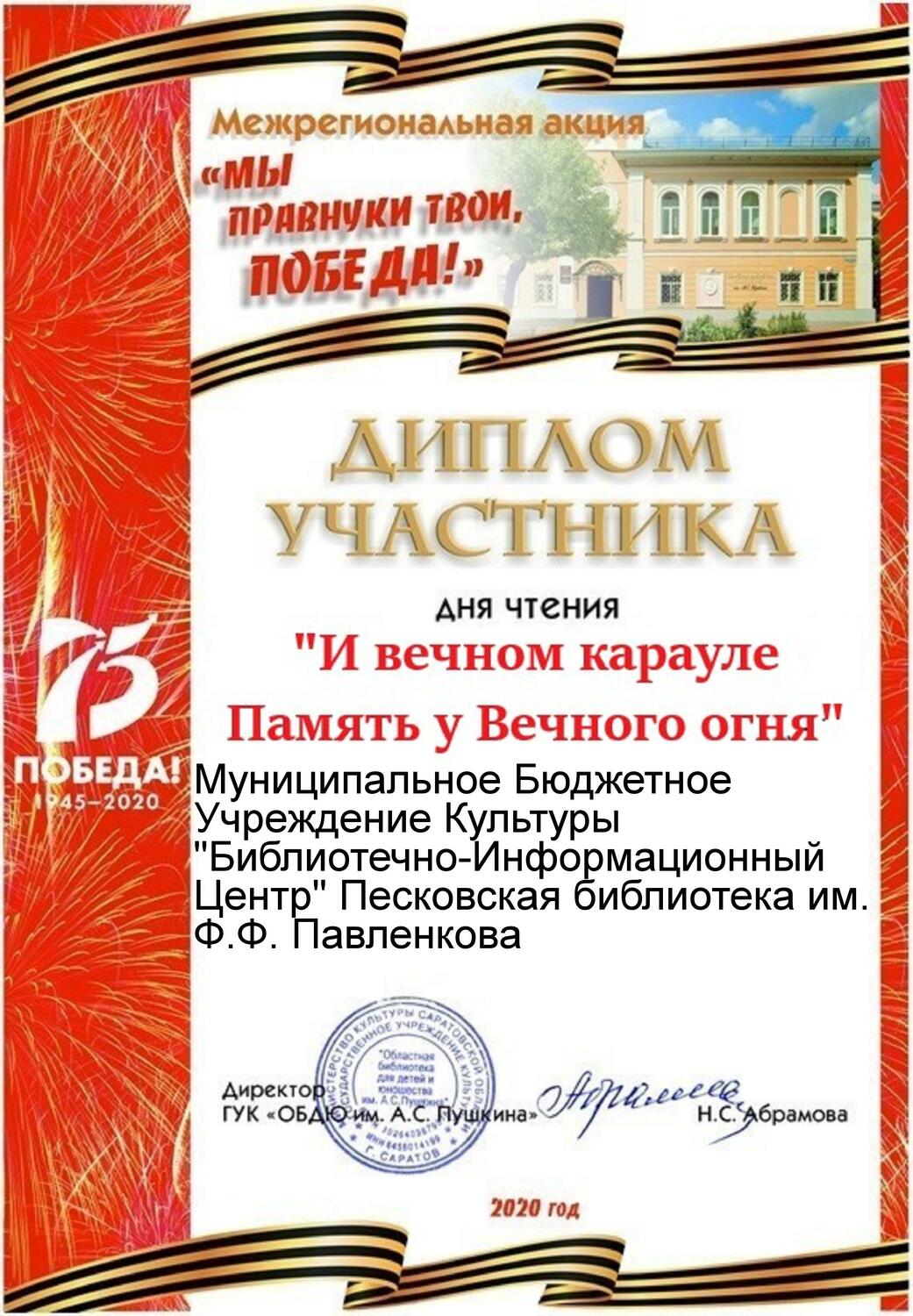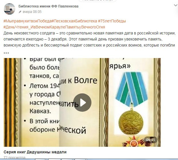 В рамках заключительного этапа Межрегиональной акции «Мы правнуки твои, Победа», организованной ГУК «Областная библиотека для детей и юношества им. А.С. Пушкина» специалисты Песковской библиотеки им. Ф.Ф. Павленкова подготовили виртуальную книжную выставку-знакомство «Дедушкины медали», авторов – фронтовиков, рассказавших детям доступно о войне. Книги выставки размещены на яндекс – диске, доступны для бесплатного скачивания в формате pdf.