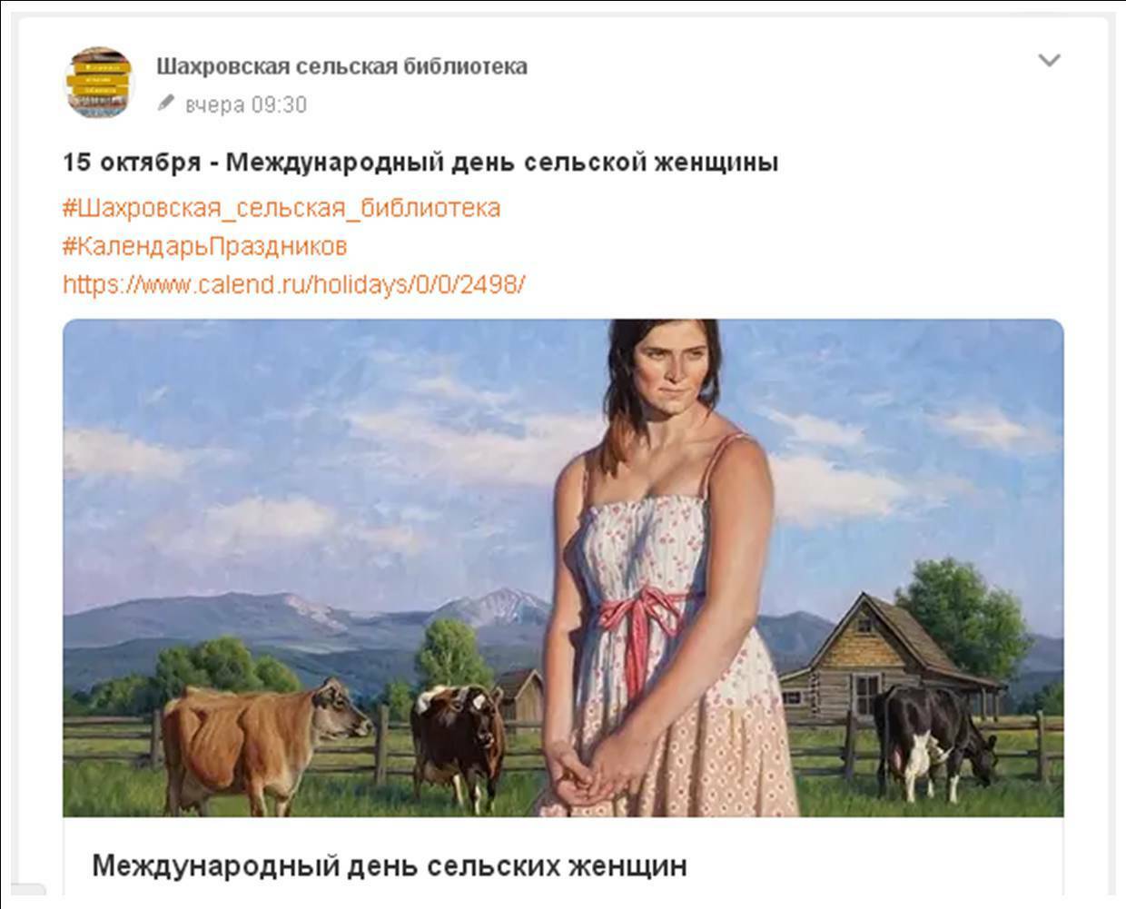 15 октября празднуется Всемирный день сельских женщин. В преддверии праздника для пользователей социальной сети «Одноклассники» Шахровской сельской библиотеки было проведено онлайн-информирование «15 октября - Международный день сельской женщины» со ссылкой на календарь событий, где все желающие могли познакомиться с историей и особенностями праздника, рекомендована подборка книг по теме «Есть женщины в русских селеньях». В предложенных романах и повестях Ф. Абрамова, М. Алексеева, В. Белова, В. Закруткина, Б. Можаева и других советских писателей отражена трагическая судьба русской женщины: женщины-труженицы, женщины-матери, женщины – защитницы.