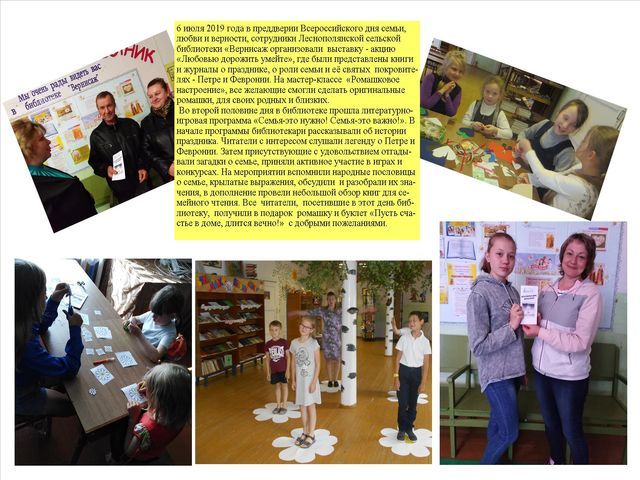 6 июля 2019 года в преддверии Дня любви, семьи и верности, сотрудники Леснополянской сельской библиотеки «Вернисаж организовали выставку - акцию «Любовью дорожить умейте», где были представлены книги и журналы о празднике, роли семьи и её святых покровителях - Петре и Февронии. На мастер-классе «Ромашковое настроение», все желающие смогли сделать оригинальные ромашки, для своих родных и близких. Продолжила акцию литературно-игровая программа «Семья-это нужно! Семья-это важно!». В начале программы библиотекари познакомили гостей с историей праздника. Читатели с интересом слушали легенду о Петре и Февронии, с удовольствием отгадывали загадки о семье, принимали активное участие в играх и конкурсах, вспомнив народные пословицы и крылатые выражения о семье, обсудив их значения. Обзор литературы представил книги для семейного чтения. Все читатели, посетившие в этот день библиотеку, получили в подарок ромашку и буклет с добрыми пожеланиями «Пусть счастье в доме, длится вечно!»