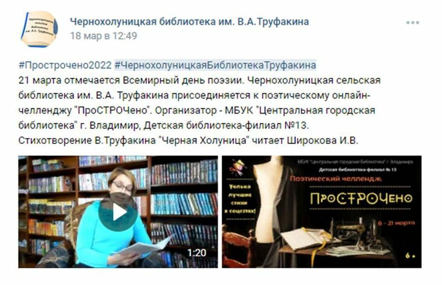 21 марта отмечается Всемирный день поэзии. Многие люди россияне любят хорошие стихи — классику ли, современные — неважно. В преддверие этого знаменательного события Центральная городская библиотека Владимира объявила поэтический онлайн – челлендж «ПроСТРОчено», активным участником которого стала Чернохолуницкая библиотека им. В.А. Труфакина.