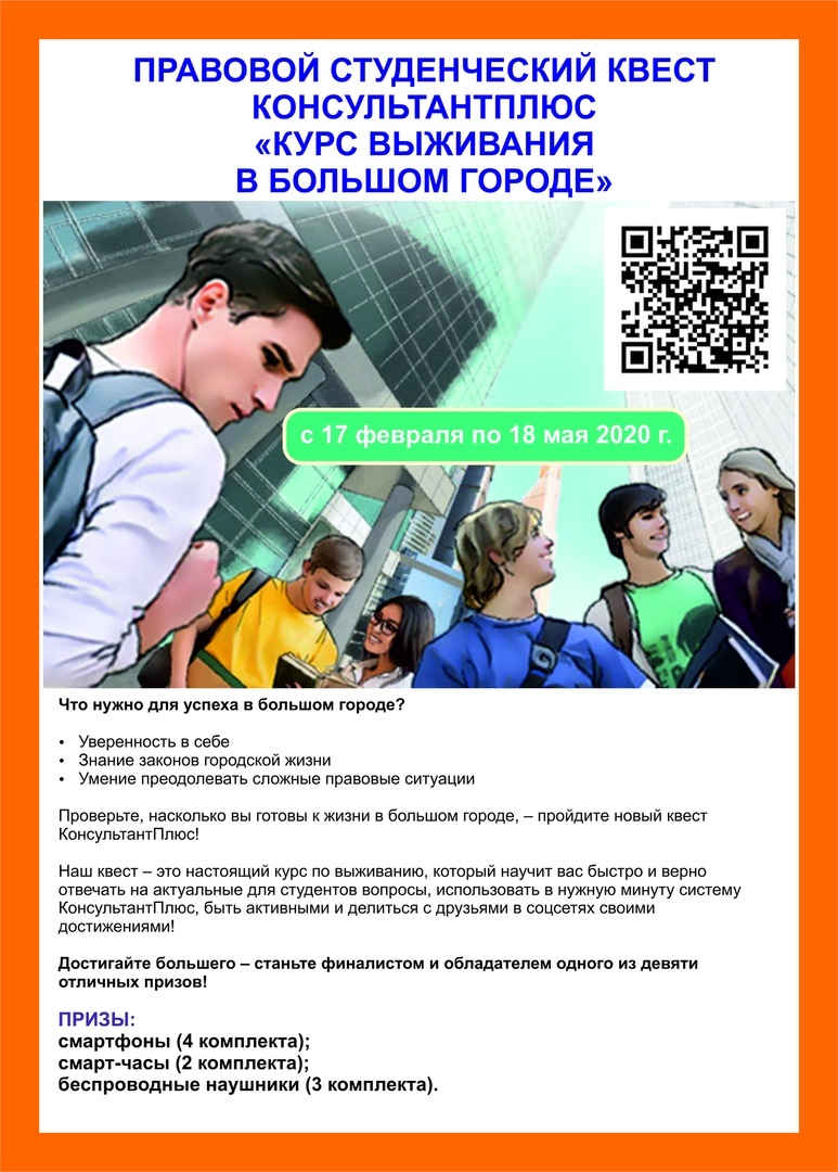 Центральная библиотека им. А.Л. Алейнова приглашает стать участниками правового студенческого квеста «Курс выживания в большом городе», организатором которого является «КонсультантПлюс». Предложение активно до 18 мая 2020 г.
