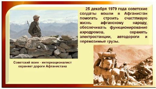 15 февраля - памятный день для каждого солдата и офицера, прошедшего афганскую войну, День вывода советских войск из Афганистана. Ровно 10 лет назад в городе Омутнинске был открыт Памятник Участникам боевых действий в Афганистане и локальных войнах. В 2020 году, к 75 - летию Великой Победы, рядом со стелой появился новый монумент – боевая машина пехоты – БМП, символизирующий единство поколений. Это место стало особо значимым для жителей города. Ежегодно в день памяти сюда приходят ветераны боевых действий, омутнинцы, чтобы почтить память россиян, исполнивших свой служебный долг за пределами Отечества, возлагают цветы. К памятной дате Детская библиотека «Маяк» предложила вниманию пользователей видеосюжет «Не обсуждая Родины приказ!», представляющий информацию о вводе советских войск в Афганистан, краткие сведения об афганской войне.