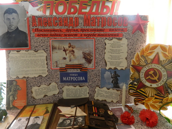 2020 год объявлен президентом России В.В. Путиным Годом памяти и славы в ознаменование 75-летия Победы в Великой Отечественной войне 1941-1945 годов. У каждого народа есть славные воинские победы во имя Отечества, память о которых передается из поколения в поколение. Подвиг Александра Матросова стал одним из символов героизма и вошел в историю Великой Отечественной войны. В феврале 1943 года девятнадцатилетний гвардии рядовой Александр Матвеевич Матросов грудью закрыл амбразуру вражеского ДЗОТа, а 19 июня 1943 года за совершение подвига Матросову Александру Матвеевичу было присвоено звание Героя Советского Союза (посмертно). Подвигу героя посвящена выставка-память "Александр Матросов: поклонитесь, друзья…", презентация, которой состоялась на странице библиотеки «Отечество» в социальных сетях.