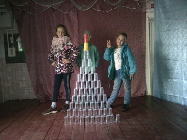 Участники самодеятельности Белореченского клуба построили высокую башню из пластиковых стаканчиков. Получилось не с первого раза, но результат порадовал – более шестидесяти стаканчиков сложились в ровную правильную пирамиду, а «строители» потренировали ловкость рук и координацию.