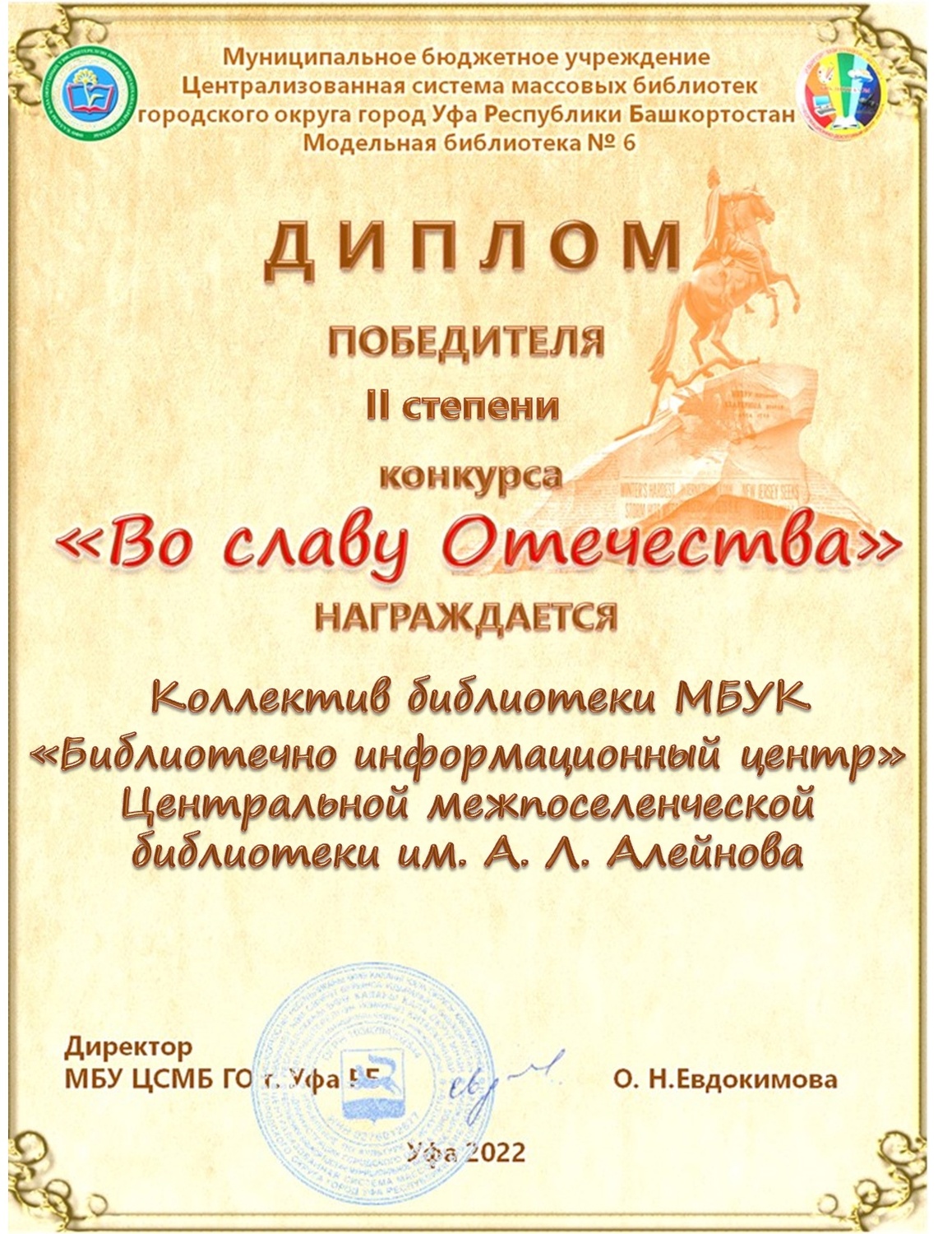 Коллектив Центральной межпоселенческой библиотеки им. А.Л. Алейнова принял участие в видеоконкурсе «Во славу Отечества», на лучшее прочтение стихотворения, посвящённого Петру I, А. Невскому, занял 2 место в категории 18+, получив Диплом победителя 2 степени. Для конкурса специалисты библиотеки выбрали и прочитали стихотворение Н. Кончаловской «Ледовое побоище».