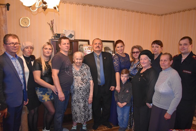 В это день Зинаида Романовна принимала поздравления от Главы Омутнинского района В.Л. Друженькова, который вручил Поздравительный адрес от Президента Российской Федерации В.В. Путина, действующих сотрудников Росгвардии, председателя районной общественной организации ветеранов МВД С.В. Деньгина.