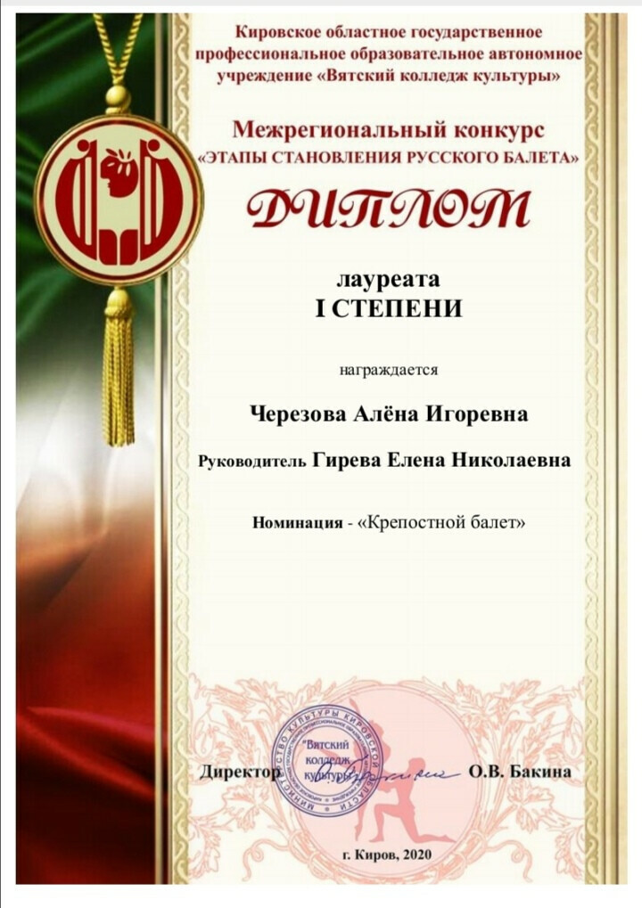Обучающаяся 4 класса хореографического отделения - Черезова Алёна (класс преподавателя Гирёвой Е.Н.) представила на суд жюри работу в номинации «Крепостной балет», за что была удостоена звания Лауреата I степени.
