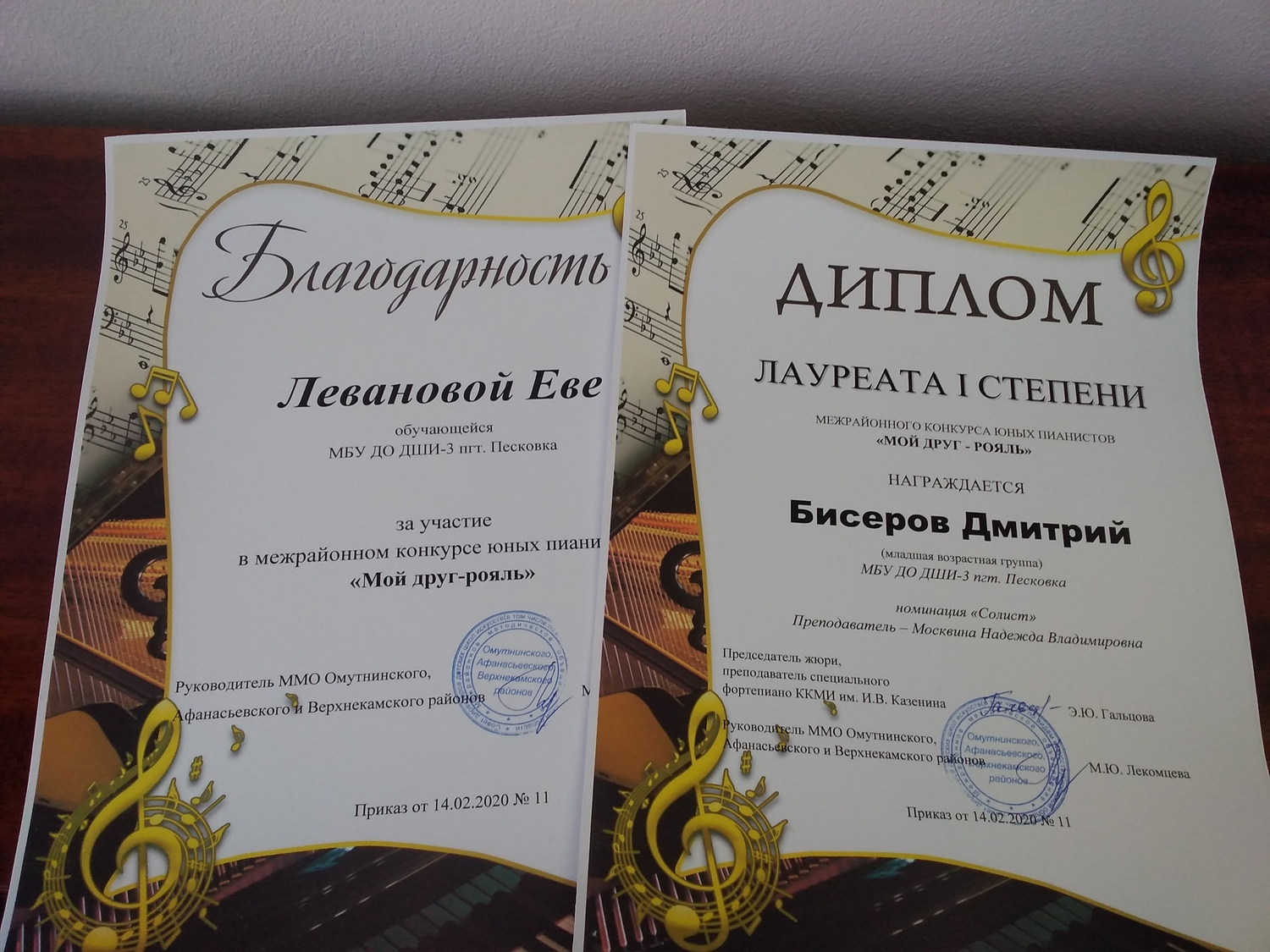 Бисеров Дмитрий (3 класс фортепианного отделения) был награжден Дипломом Лауреата I степени. Благодарственным письмом — Леванова Ева (1 класс фортепианного отделения).