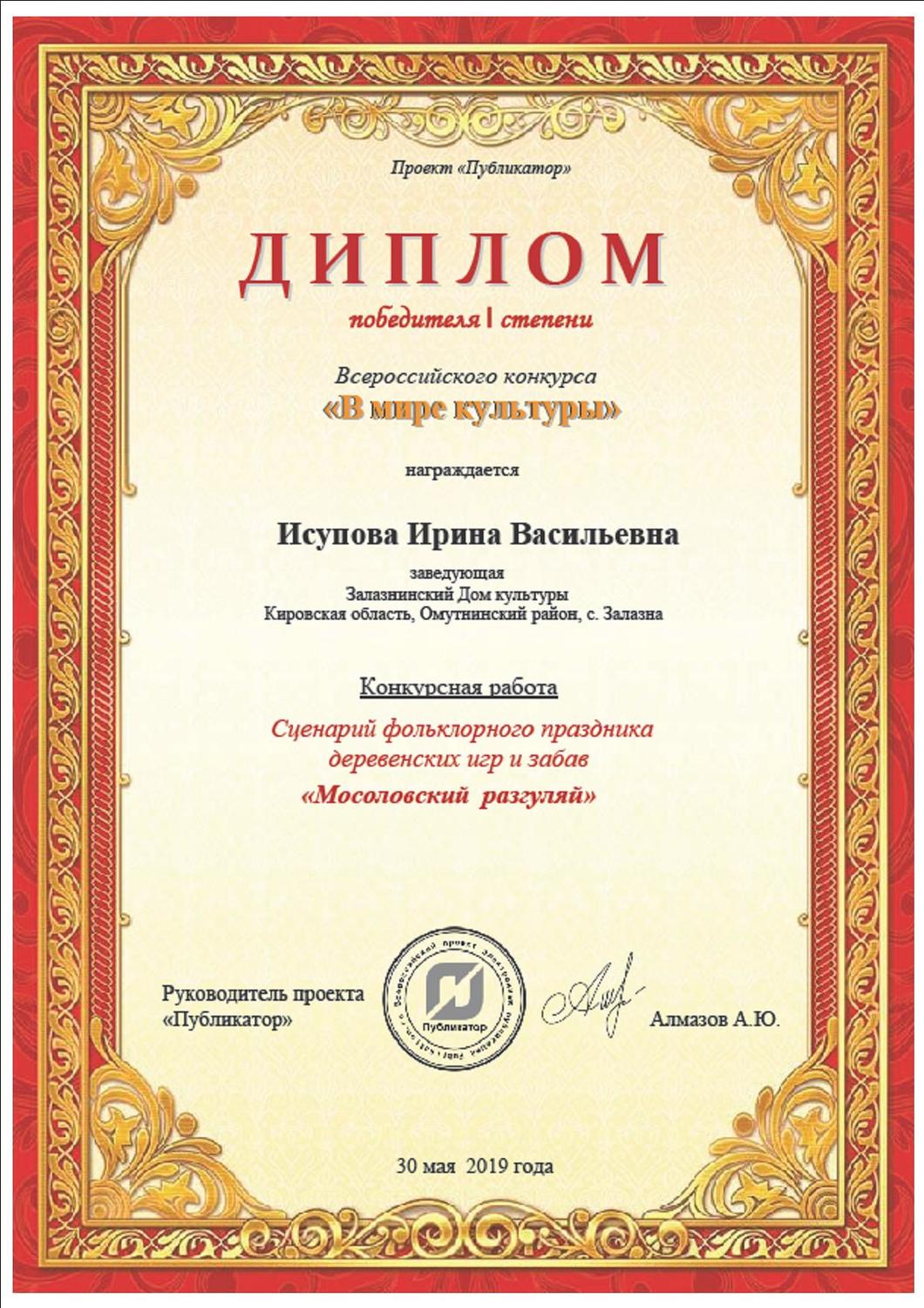 Заведующий Залазнинским Домом культуры Ирина Васильевна Исупова стала победителем I степени Всероссийского конкурса «В мире культуры», организованного в рамках проекта «Публикатор».