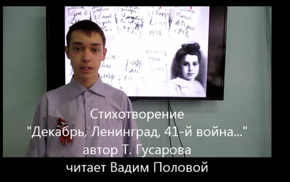 В преддверии Дня Победы в Библиотеке №5 «Авангард» г. Кирова состоялся заочный конкурс чтецов «Строки, опаленные войной», участниками которого стали два юных читателя Библиотечного центра «Дом семьи» им. Н.А. Заболоцкого. Среди 116 выступлений стихотворение Т. Гусаровой «Дневник Тани Савичевой», прочитанное Вадимом Половым, вошло в число призеров конкурса в возрастной категории 12-15 лет.