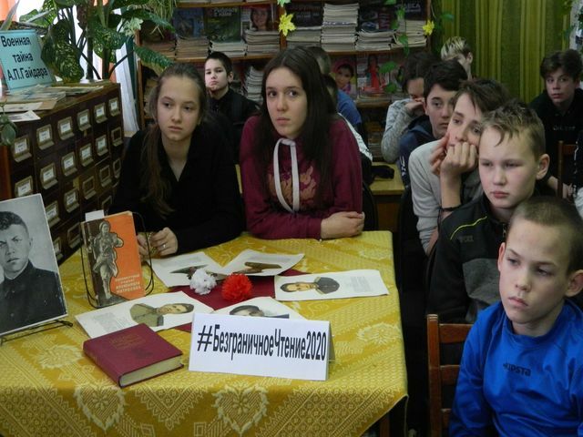 Уроком мужества с прочтением глав книги Шкадаревич И.И. «Бессмертный подвиг Александра Матросова» библиотека «Отечество» присоединилась к III Межрегиональной акции «Безграничное чтение» с подростками 6-х классов МКОУ ООШ №7. В феврале 1943 года А. Матросов совершил свой бессмертный подвиг, закрыв грудью амбразуру немецкого дзота. Как сформировался такой отважный характер, каким человеком он был в жизни? Как совершил свой подвиг? Как увековечена память о нем в нашей стране и на родине героя? Об этом и многом другом поведали школьникам книга Шкадаревич И.И. «Бессмертный подвиг Александра Матросова» и кадры документального фильма «Александр Матросов. Правда о подвиге». Участники урока мужества познакомились с именами героев, совершивших в годы войны подвиг, аналогичный подвигу Александра Матросова, закрывшего своим телом вражескую амбразуру, спасшего ценой своей жизни десятки жизней своих товарищей. Таких героев в годы войны было более 400 человек. Среди них есть наш земляк уроженец Верхнекамского района Яков Падерин, которому посмертно присвоено звание Героя Советского Союза. Подвиг Матросова стал символом храбрости и самопожертвования и примером безграничного мужества и героизма и память о нем и его последователях должна передаваться из поколения в поколение.