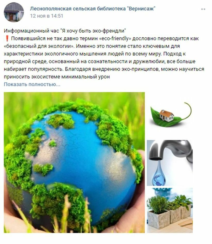 Леснополянская сельская библиотека «Вернисаж» в формате онлайн предложила вниманию пользователей информационный час «Я хочу быть эко-френдли». В рамках встречи было раскрыто понятие термина «eco-friendly», ключевые характеристики экологичного мышления людей по всему миру. Представлены правила экологичного образа жизни: употребление натуральных продуктов, езда на экологичном транспорте, отказ от пластика в пользу экосумок или бумажных пакетов, использование энергосберегающих лампочек и тд. В заключение сделан вывод, что даже такие, казалось бы, жизненные мелочи способны улучшить экологическое состояние России и планеты в целом.