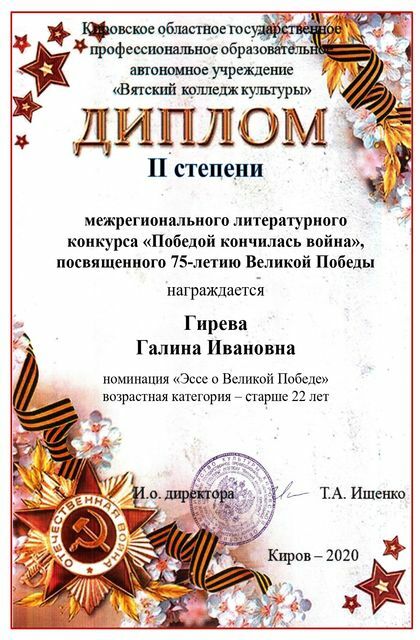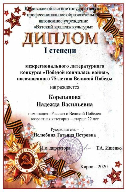 Сотрудники МБУК «Библиотечно – информационный центр» стали активными участниками межрегионального литературного конкурса «Победой кончилась война», организованного Вятским колледжем культуры. Жюри по достоинству оценило конкурсные работы участников: Корепанова Надежда Васильевна, библиотекарь сектора обслуживания читателей стала обладателем Диплома I cтепени в номинации «Рассказ о Великой Победе», Позняк Мария Павловна, библиотекарь информационно – библиографического сектора награждена Диплом II степени в номинации «Рассказ о Великой Победе», Мечёва Наталья Владимировна, библиотекарь сектора обслуживания читателей отмечена Диплома III cтепени в номинации «Рассказ о Великой Победе», Пыхтеева Ольга Викторовна, библиотекарь сектора обслуживания читателей отмечена Дипломом II степени в номинации «Чтецы Великой Победы», Гирёва Галина Ивановна, библиотекарь Загарской сельской библиотеки отмечена Дипломом II степени в номинации «Эссе о Великой Победе».
