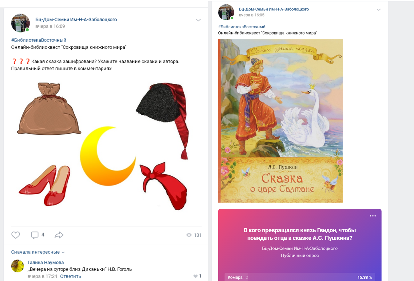 В рамках недели детской и юношеской книги в библиотечном центре «Дом семьи» им. Н. А. Заболоцкого прошёл виртуальный библиоквест «Сокровища книжного мира». Участникам предстояло отгадать названия приключенческих книг по обложке, ответить на вопросы викторины по сказкам А.С. Пушкина, разгадать названия и авторов произведений в зашифрованных рисунках. Самые активные участники отмечены сертификатами.
