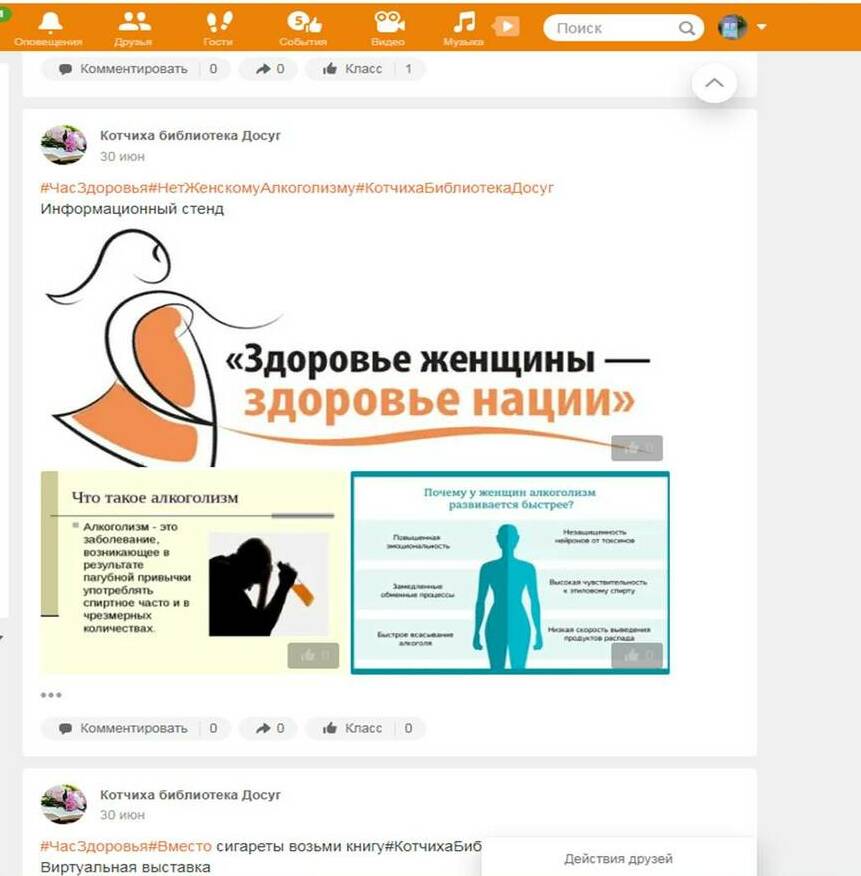 В последнее время отмечается интенсивный рост женского алкоголизма. С целью профилактики Котчихинская сельская библиотека «Досуг» на странице библиотеки в социальной сети представила виртуальный стенд «Здоровье женщины – здоровье нации». Информация на стенде раскрывает понятие «алкоголизм», причины, последствия, лечение женского алкоголизма и т.д.