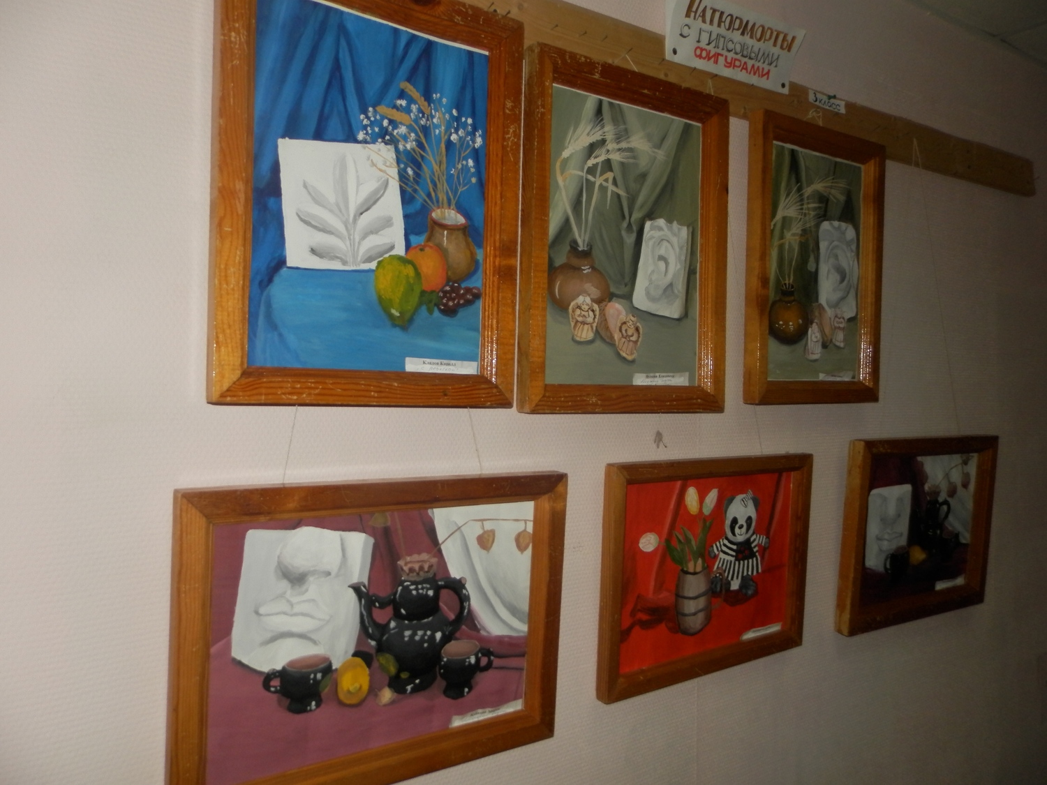 7-8 апреля на втором этаже здания «Детской школы искусств» пгт. Песковка прошла выставка творческих работ «Натюрморты с гипсовыми фигурами» Рисунки выполнены учащимися 3 класса художественного отделения в технике гуаши. Преподаватель Зайлер Е.П.