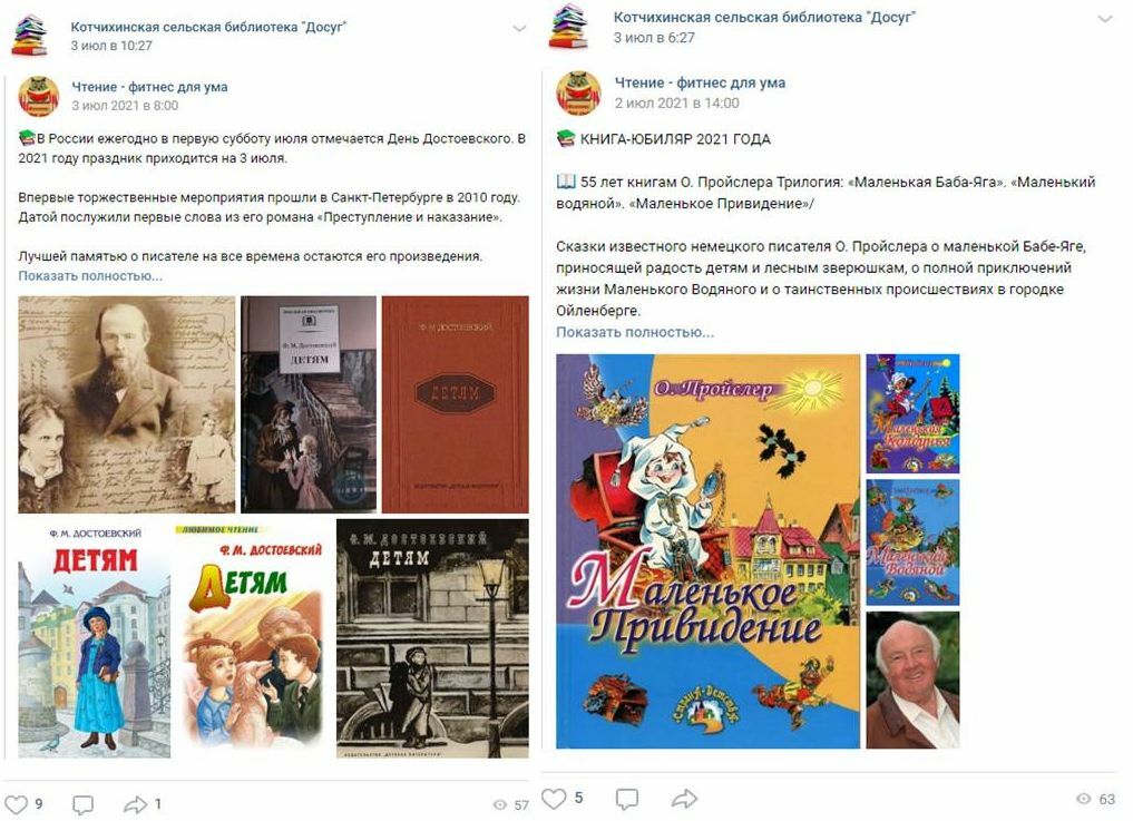 Активным вниманием пользователей Котчихинской сельской библиотеки «Досуг» пользуется рубрика «Чтение – фитнес для ума», организованная в социальной сети «ВКонтакте». Героями прошедшей недели в ней стали Ф.М. Достоевский, день памяти которого ежегодно отмечается в первую субботу июля, его проект «Дневник писателя» и Отфрид Пройслер, автор юбилейной трилогии «Маленькая Баба-Яга», «Маленький водяной», «Маленькое Привидение». Очерки и повести написаны простым, легким, доступным для детей языком.