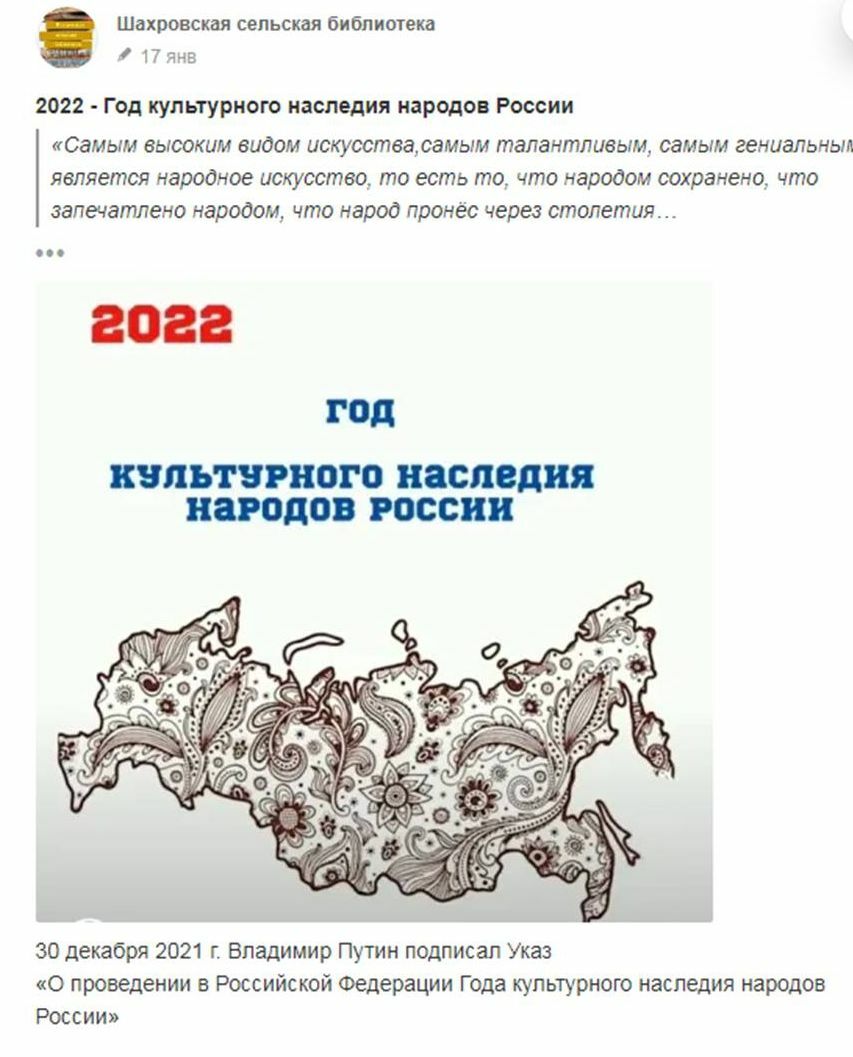 Шахровская сельская библиотека проинформировала пользователей о стартовавшем в России Годе культурного наследия народов России, организованного в целях популяризации народного искусства, сохранения культурных традиций, памятников истории и культуры, этнокультурного многообразия, культурной самобытности всех народов и этнических общностей России. Планы года огромны: этнофестивали, народные выставки, конкурсы, концерты, акции.