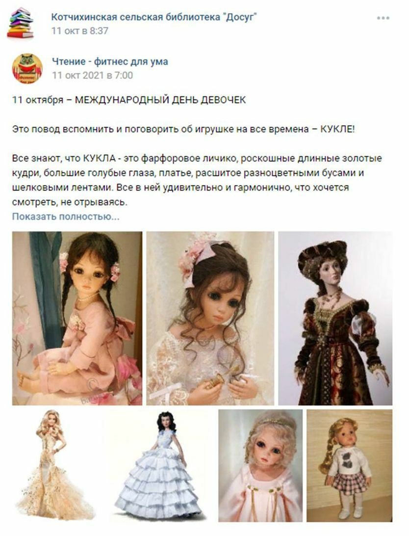 К Международному дню девочек Котчихинская сельская библиотека «Досуг» предложила представительницам прекрасного пола вспомнить и поговорить об игрушке на все времена – КУКЛЕ! Данные говорят о том, что человечество играет в куклы почти 40 тысяч лет! Гостям страницы была представлена история этой уникальной, красивейшей игрушки, продемонстрированы коллекционные экземпляры. Пусть куклы постоянно меняют свой облик, но их главная цель - доставлять радость ребенку.