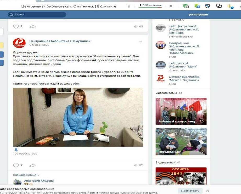 В День празднования Великой Победы Центральная библиотека им. А.Л. Алейнова на своих страницах в социальных сетях «ВКонтакте» и «Одноклассники» провела мастер – класс по изготовлению объёмной фигуры журавля, как символа солдатского мужества, героизма, памяти.