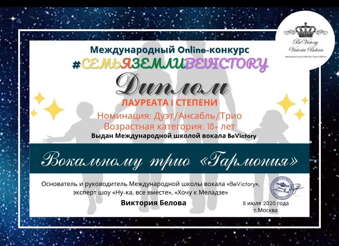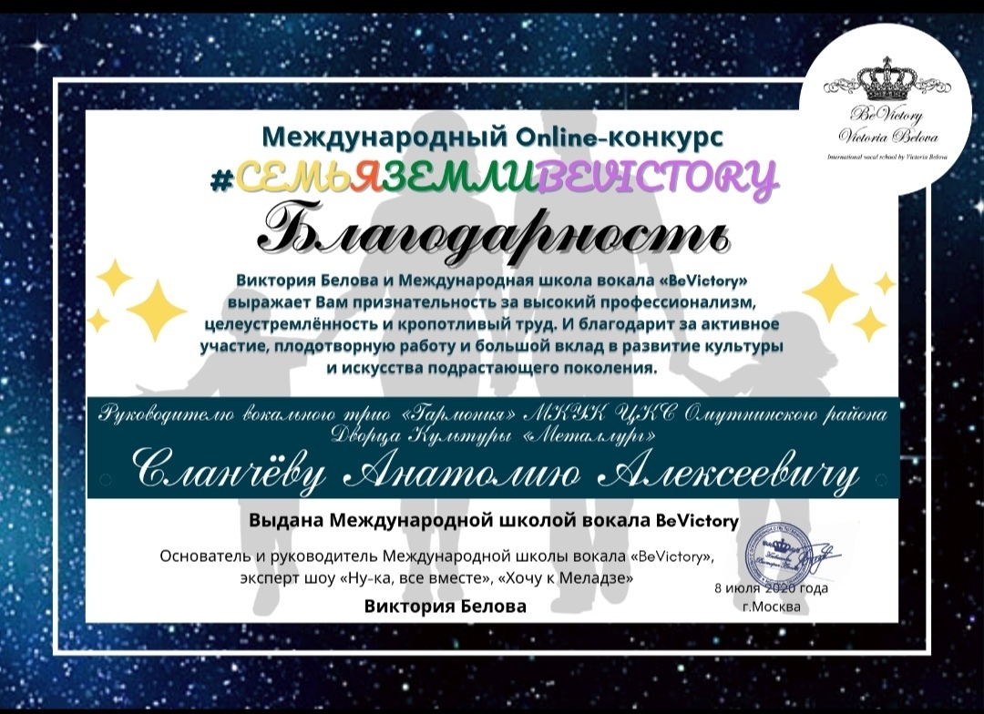 В июне состоялся Международный вокальный онлайн-конкурс «#СЕМЬЯЗЕМЛИBEVICTORY» к Дню семьи, любви и верности, организованный руководителем Международной Школы вокала Викторией Беловой. Виктория Белева является экспертом телешоу «Ну-ка, все вместе!» на канале «Россия 1», вокальным наставником «Хочу к Меладзе» на канале «НТВ».