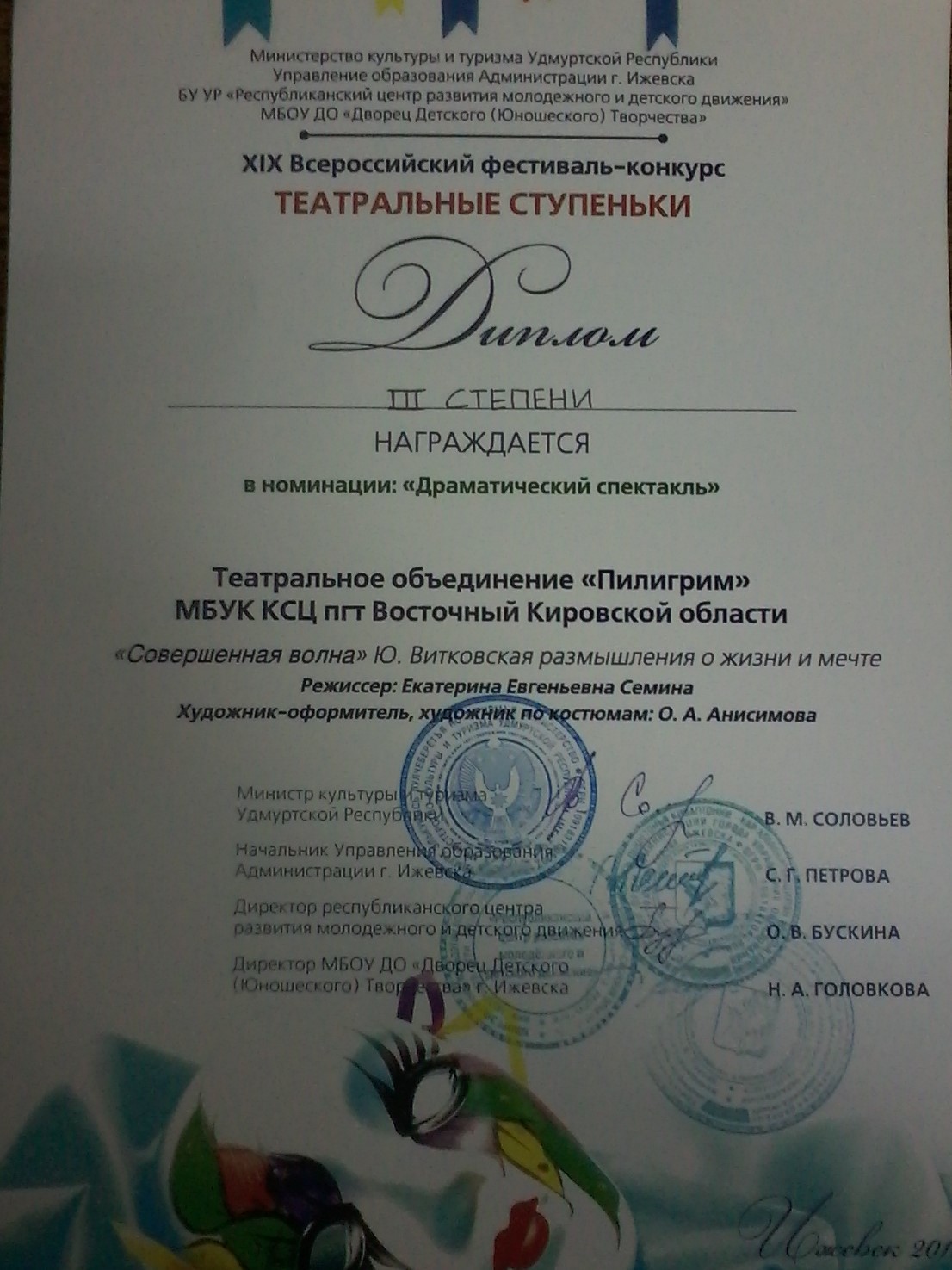 После премьеры юные артисты вместе с руководителем отправились покорять XIX межрегиональный фестиваль-конкурс «Театральные ступеньки» в Ижевске, где пробыли несколько дней, общаясь с театральными коллективами из других городов и узнавая новые тонкости театрального мастерства. В рамках фестиваля ребята получили диплом 3-й степени в номинации «Драматический спектакль», а исполнительница главной роли, Варвара Киреева, получила диплом в номинации «Лучшая актерская работа». А 30 марта ребята привезли постановку в Омутнинск на межрайонный театральный фестиваль «На пятачке» в ДК «Металлург», в котором принимали участие коллективы из Омутнинска, Песковки и Глазова.