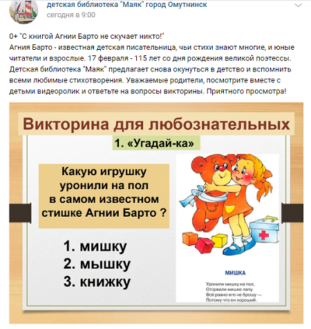 Детская поэтесса Агния Барто - одна из самых известных и любимых читателями детских поэтов. Ее стихи известны всем, веселые, интересные, понятные каждому. Слушая и читая произведения Агнии Львовны, ребёнок обязательно увидит, кому следует подражать, а на кого лучше не быть похожим. К юбилею автора Детская библиотека «Маяк» предложила вниманию юных пользователей фильм, рассказывающий о жизни и творчестве автора. После просмотра все желающие смогли ответить на вопросы викторины.