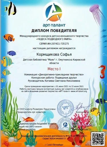 Участниками международных конкурсов детско – юношеского творчества «Удивительные цветы» и «Чудеса подводного мира», организованного Академией творчества «Арт – талант» стали участники творческой студии «Цветные ладошки», активные читатели Детской библиотеки «Маяк» - Кормщикова Софья, Шихов Дмитрий. Конкурсные работы участников отмечены Дипломами за 1 место.