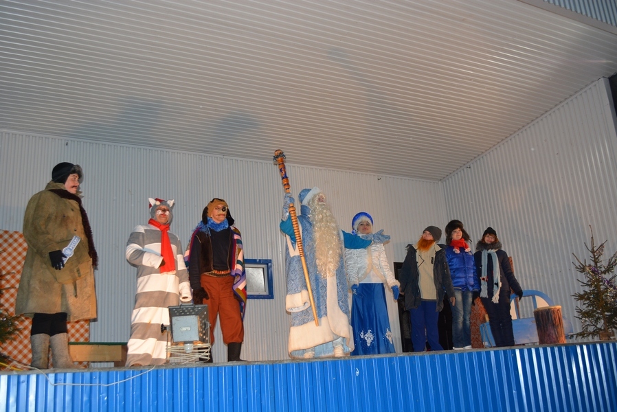 Программа началась с награждения победителей и участников конкурса «Украшение для городской новогодней елки». Глава администрации Омутнинска Игорь Шаталов поздравил гостей мероприятия с наступающими праздниками и поблагодарил за активное участие в конкурсе. Именно благодаря жителям города наша елка в этом году украшена большими, яркими, а главное, созданными своими руками игрушками. В номинации «Волшебный клубок» победителями стали ОАО «ЭнергосбыТ Плюс», диплом за 2 место получила государственная школа г. Омутнинска, 3 место у общественной организации пенсионеров, ветеранов и инвалидов АО «ОМЗ».В номинации «На пороге Новый год – уже собака у ворот» первое место занимает игрушка Управления муниципальным имуществом и земельными ресурсами администрации муниципального образования Омутнинский муниципальный район Кировской области, на втором месте детский сад «Теремок», диплом за 3 место получил магазин «Электротовары». Самой многочисленной стала номинация «Новогодние эко – игрушки: свечи, шарики, хлопушки…». Победителем в этой номинации стал магазин «Цветочный мир», диплом за 2 место получил магазин «Лавка чудес», 3 место у молодежного клуба «Виктория».Была организована и специальная номинация – «Народный выбор», в Интернете прошло голосование, в котором приняли участие жители города. Каждый мог отдать свой голос за понравившуюся новогоднюю игрушку. По итогам голосования победителем в этой номинации стал детский сад «Малыш».Далее гости праздника перенеслись в сказочную атмосферу деревни Простоквашино, где папа дяди Федора отправился за елкой, но почтальон Печкин, рассердившись, что все пытаются елки в лесу срубить, отправил его не той дорогой. А Снегурочке Печкин тоже елочку дал маленькую и неказистую. Дядя Федор, Кот Матроскин и Пес Шарик дружно вытащили папу из заноса, из города встречать Новый год в Простоквашино приехала и мама. Дедушка Мороз нашел настоящую елочку-красавицу, которую все дружно зажгли. А почтальон Печкин, конечно, подобрел. Герои представления поздравили жителей города, а дети танцевальной студии «Браво» завели у сцены дружные хороводы, к которым присоединились и герои сказки. Программа закончилась веселыми Простоквашинскими затеями, дети и взрослые с радостью участвовали во всех играх, пели песни и поздравляли жителей города с наступающим Новым годом.