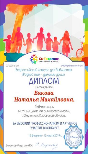 Всероссийский конкурс «Родной язык дыхание души», организованн по инициативе редакции Центра развития творчества «Со-Творение» для библиотекарей муниципальных библиотек. На конкурс была представлена работа Бяковой Натальи Михайловны, библиотекаря детской библиотеки «Маяк» в номинации «Сценарий мероприятия». За высокий профессионализм работа отмечена дипломо.