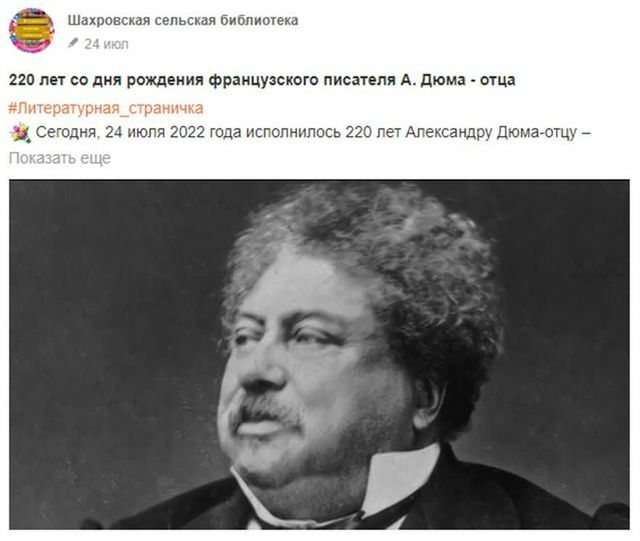 Рубрика «Литературная_страничка» Шахровской сельской библиотеки социальной сети Одноклассники предложила вниманию пользователей онлайн обозрение биографии и творчества Александра Дюма-отца – знаменитого французского писателя, драматурга, журналиста, которому в июле 2022 года исполнилось 220 лет со дня рождения. Творчество автора – это эпоха рыцарства, турниров, прекрасных дам и смелых мужчин, когда честь и достоинство ценились, прежде всего. Джек Лондон говорил: «Какое великое счастье, что для людей, близких к отчаянью, существует утешительный Дюма». Пользователи вспомнили бессмертные творения А. Дюма: «Три мушкетера», «Двадцать лет спустя», «Королева Марго», «Графиня де Монсоро», «Робин Гуд – король разбойников», «Граф Монте - Кристо» и др.