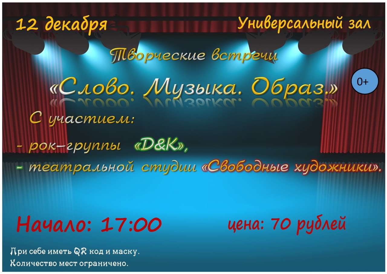 17. 00 Творческие встречи «Слово. Музыка. Образ» с участием рок-группы «D&K» и театральной студии «Свободные художники» (0+) универсальный зал