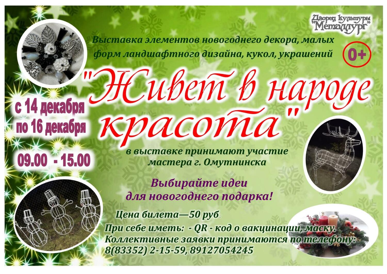 09. 00 - 15. 00 Выставка элементов новогоднего декора, малых форм ландшафтного дизайна, кукол, украшений «Живет в народе красота» (0+) Цена билета: 50 рублей.