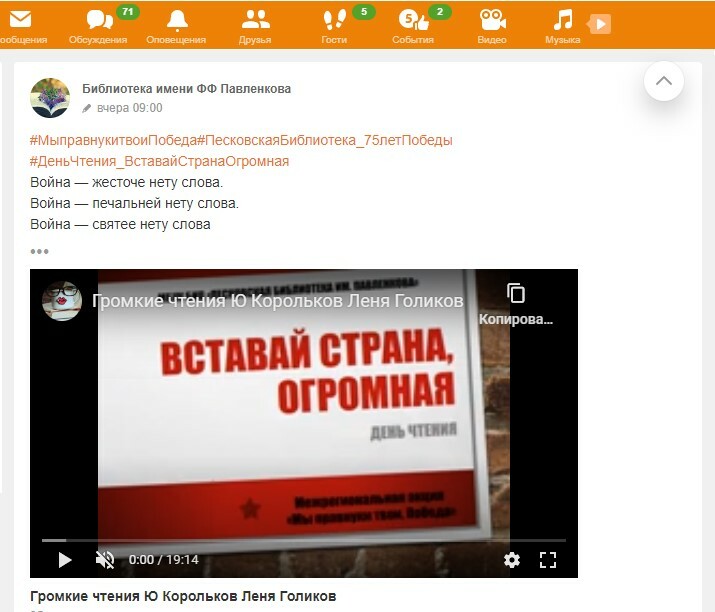 Ежегодно, 22 июня, мы вспоминаем начало война. Пока жива память об этом событии, пока жива в наших сердцах благодарность тем, кто отстоял честь, свободу и независимость нашей Родины, наше государство будет - независимым, а народ – непобедимым. Песковская библиотека им. Ф.Ф. Павленкова присоединилась к очередному этапу Межрегиональной акции «Мы правнуки твои, Победа», организованной ГУК «Областная библиотека для детей и юношества им. А.С. Пушкина», организовав день чтения «Вставай страна, огромная» в режиме онлайн, познакомив пользователей социальных сетей с произведением Юрия Королькова «Партизан Лёня Голиков».