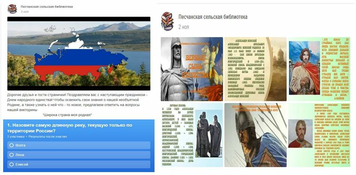Песчанская сельская библиотека в День народного единства предложила вниманию пользователей онлайн – информацию «Верные сыны Отечества», посвящённую биографии и военным подвигам Александра Невского. Далее каждый желающий смог принять участие в исторической викторине «Широка страна моя родная».