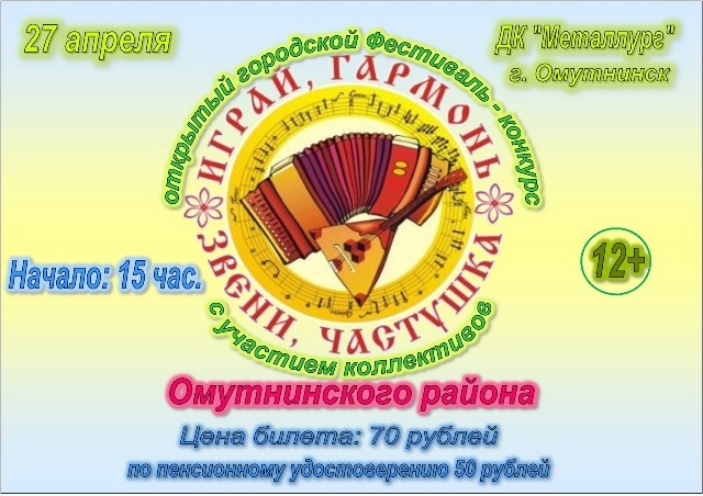 15.00 Открытый городской фестиваль-конкурс «Играй, гармонь, звени, частушка» (12+)