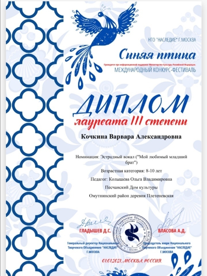 Особенно престижным для Песчанского Дома культуры стал диплом Лауреата III степени международного конкурса-фестиваля «Синяя птица» Кочкиной Варвары.