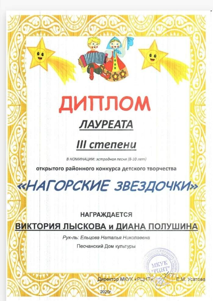 Солисты детской вокальной студии «Карусель» стали участниками открытого районного конкурса детского творчества «Нагорские звездочки». Дипломом I степени в номинации «эстрадная песня» награждена Кочкина Варвара; дипломом Лауреата III степени в номинации «эстрадная песня» отмечены Виктория Лыскова и Диана Полушкина.