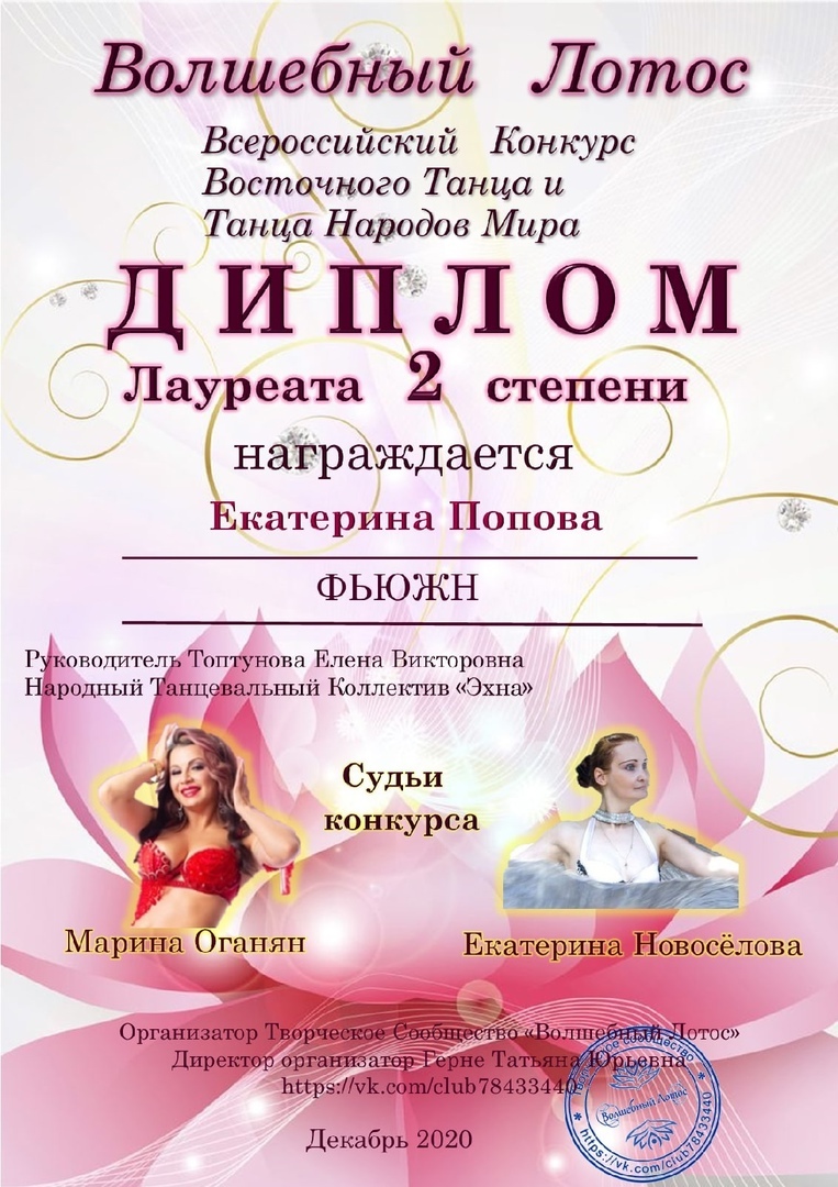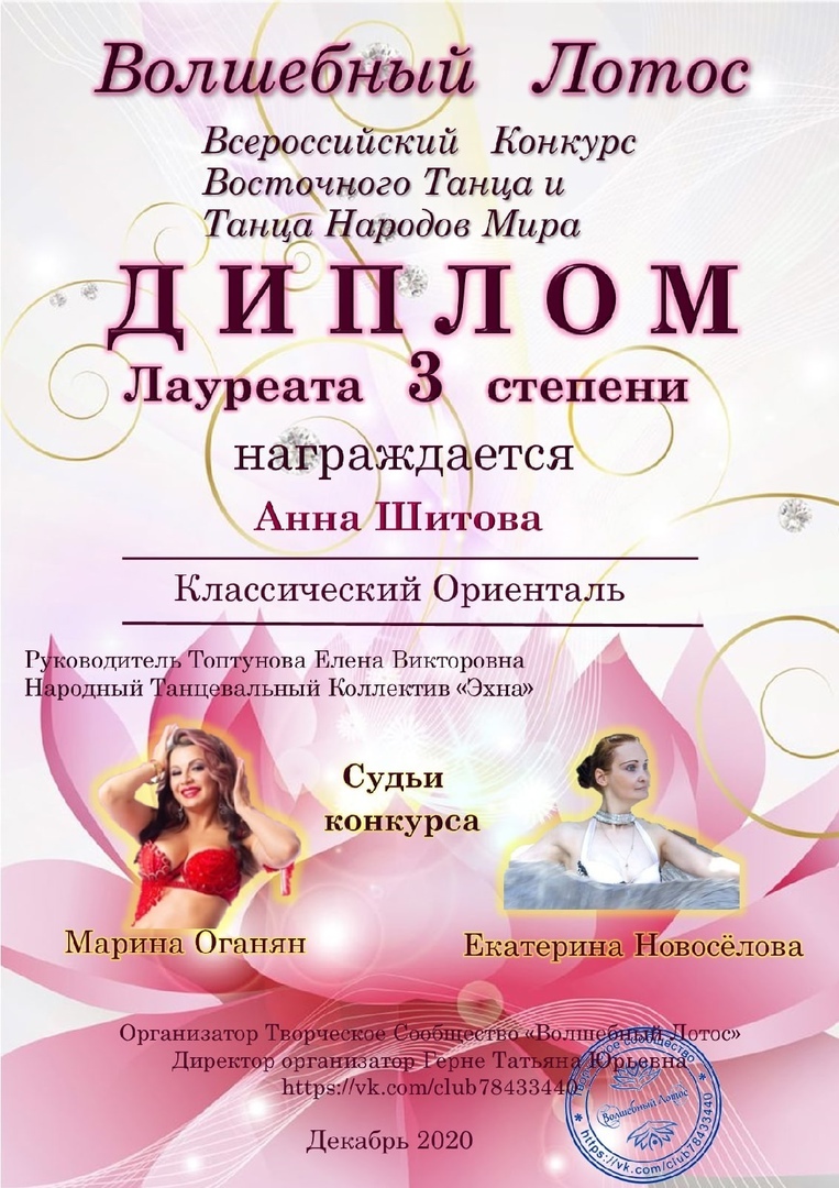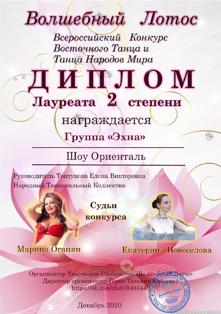 Народный танцевальный ансамбль «Эхна», руководитель – Елена Топтунова, стал Лауреатом VI Всероссийского онлайн-конкурса «Волшебный Лотос». В «копилке» коллектива появились сразу шесть призовых дипломов.Александра Сюзева и Анна Шитова в номинации «Oriental» получила диплом Лауреата III степени, Екатерина Попова в номинации «Фьюжн» стала Лауреатом II степени, дуэт Натальи Поповой и Веры Воробьевой в номинации «Шоу oriental» получил диплом Лауреата III степени.Танец «Сияние арабской ночи» в номинации «Шоу группы» завоевал диплом Лауреата II степени. Танец «Ираки» в номинации «Фольклор арабских стран» получил диплом Лауреата III степени.