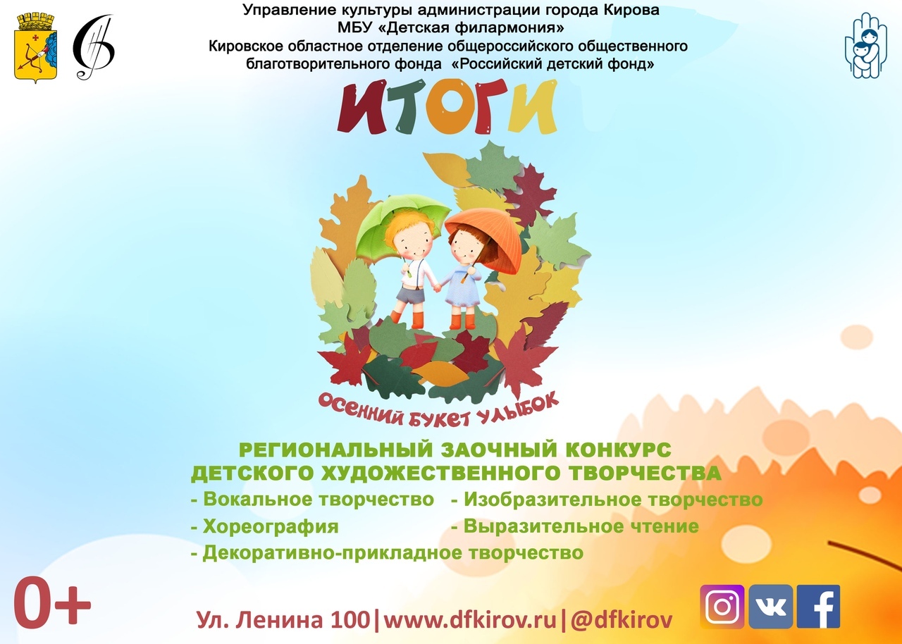 В Детской филармонии г. Кирова завершился Региональный заочный конкурс детского художественного творчества «Осенний букет улыбок». Конкурс проводился при поддержке управления культуры администрации города Кирова и Кировского областного отделения «Российского детского фонда».Участниками конкурсных состязаний в различных номинациях стали 1018 юных артистов и художников из Кировской, Саратовской, Ярославской, Владимирской, Нижегородской, Архангельской областей, Татарстана, Бурятии и других регионов страны.Учащиеся Омутнинской ДШИ приняли участие в номинации «Выразительное чтение», и все были отмечены жюри. В возрастной номинации «5-6 лет» диплом II степени получила Тамила Леушина (класс А.А. Бояринцевой), а лауреатом III степени стала Василиса Попова (класс М.Ю. Лекомцевой). Среди участников 7-8 лет был отмечен наш Иван Дюпин: он получил диплом I степени. Целая россыпь наград – в возрастной группе «9-10 лет». Так, Александр Васильев и Артем Червяков стали дипломантами II степени, Константин Птицын и Владислав Пацианский – дипломантами I степени. Лауреатами III степени стали Дарья Логинова и Милана Варицкая. Все ребята, участвовавшие в группах «7-8 лет» и «9-10 лет», являются учениками Марины Юрьевны Лекомцевой.Отметим, что для самых младших артистов – Василисы Поповой и Тамилы Леушиной – этот конкурс был дебютным. В каждой возрастной группе ребята конкурировали с большим количеством ровесников из разных регионов России. Радует, что ДШИ Омутнинска была представлена на этом проекте столь мощным творческим десантом.