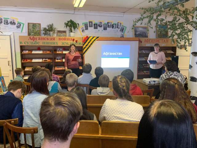 Вся аудитория была вовлечена в водоворот тех страшных событий, где картину прошедшей войны помогало зримо увидеть все: и презентация о наших земляках воевавших в Афганистане, икадры военной хроники, и стихи, и песни тех лет. Эмоционально, ярко звучал рассказ учителя истории Репиной Светланы Николаевны, о том, сколько горя, бед и страданий принесли нашему народу эти 9 лет жестоких сражений в чужом краю. В библиотеке царила особая атмосфера, в ней ощущались и искреннее сочувствие, и сопереживание. Эта встреча позволила всем присутствующим прикоснуться к одной из самых трагических страниц нашей истории. Время неумолимо отсчитывает годы и десятилетия. Но мы обязаны помнить об этой войне, о наших соотечественниках, прошедших огненные версты Афганистана. Помнить о тех, кто живет среди нас сегодня, и о тех, кого нет, ведь они – пример настоящего мужества и патриотизма, верности долгу.
